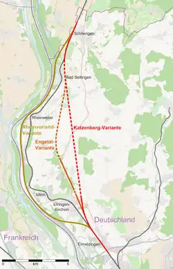 In the early 1980s, different options for the section between Schliengen and Eimeldingen were discussed: "Rhine foreland option" (Rheinvorlandvariante), a route that ran above ground and largely just to the east of the Rhine, had a top speed of 200 km/h and had substantial effects on residences. In addition, two options (Engetal—Enge valley—and Katzenberg) with tunnels up to 8 km long were developed.[17][18] In addition, there was the "Zimmermann option", which involved the upgrading of the existing line.[16] The Rhine foreland option, initially preferred by the Deutsche Bundesbahn, was subject to many different criticisms in the region. The Katzenberg tunnel option that was ultimately built was developed between 1977 and 1981 by the local engineer Albert Schmidt and his staff at their own expense.[19] The proposal was taken up by former project manager Ernst Krittian.[20]
