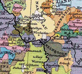 William "the Rich" of Nassau-Siegen had to renounce his claims to Katzenelnbogen, which definitively fell to Hesse.[2] In compensation, William received 600,000 florins for his claims to the inheritance, a quarter of which was to be paid by Hesse in land and the rest in money over a period of eight years.[1] Nassau was given the Hessian quarter of the county of Diez, including the districts of Camberg, Weilnau, Wehrheim, Ellar, Driedorf, and half of Hadamar.[1] Although William had received lavish compensation with this, the county of Nassau-Siegen had been weakened by the long battle and the loss of Katzenelnbogen.[2] Years of mismanagement and the war had left Nassau-Siegen's administration and finances in shambles.[2]