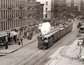 In 1846 the City of New York allowed the Hudson River Railroad Company to lay the tracks for its new line to Albany directly on the streets, "westerly of and including Eighth Avenue or Hudson Street.[2]: 82 For more than seventy years steam trains ran directly on major streets and avenues of New York.[2]: 82 The elevated rapid transit lines on the Manhattan were converted from steam to third rail electrical traction in 1900–1903,[3]: 16 the passenger trunk lines were gradually electrified over the next decades.