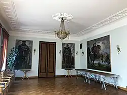 The Dukes' Hall is located in front of the Great Hall. It reused furniture and chandeliers from the old club building.[3] It is dedicated to the Grand Dukes of Lithuania and King Mindaugas. Their full-length portraits were completed in 1937 by Petras Kalpokas. After World War II, the paintings were missing for many years. They were unexpectedly found in the Vytautas the Great War Museum – removed from the frames and rolled up they were inventoried as "unknown paintings of dukes".[7] The paintings depict King Mindaugas, Grand Dukes Vytenis, Kęstutis, Gediminas (father of the Gediminids dynasty), Algirdas, and Vytautas the Great. The painting of Gediminas was severely damaged, and it is believed that Soviet soldiers used it to play darts.[6]