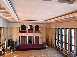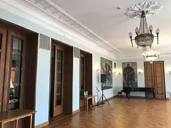 The hall has two balconies: one for the spectators and the other for the musicians. The balconies have bas-reliefs by Petras Rimša that depict four branches of the military.[3] The ceiling is 8 metres (26 ft) in height and features a coffer with tulips.[6] The white ceiling is illuminated with yellow, green and red lights – colors of the Lithuanian flag. Such lighting was installed when the building was built.[5] The columns are covered with marble, windows feature tulip motifs, and radiators are hidden by bronze grates. The black grand piano, made by Steinway & Sons in 1936, was likely gifted by the First Lady Sofija Smetonienė in 1939. Behind the grand piano, doors lead to a small winter garden that during the interwar period had a fountain.[6]