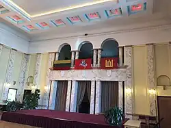 Kaunas Garrison Officers' Club Building (Lithuanian: Kauno įgulos karininkų ramovė) is a building in Kaunas, Lithuania. At construction cost of over 1.27 million Lithuanian litas, it was one of the most luxurious buildings built in interwar Lithuania. Located next to Laisvės alėja, the main pedestrian street, the building features nationalistic symbolism and decorative folk motifs.[1] The second of the four floors has four formal rooms of grand but eclectic design. Their interior pays homage to the Grand Duchy of Lithuania and was designed by prominent Lithuanian artists. Built in 1935–1937, the building served as the headquarters of the Officers' Club of the Lithuanian Army and venue for various official events. The building suffered great damage in the Lithuanian SSR (1945–1990). The Lithuanians recovered the building from the Russian Army in 1992 and it was taken over by the Lithuanian Armed Forces in 2000. In the early 2000s, the building underwent major renovation to restore and recreate as much of the authentic interwar decor as possible. In 2015, the building was one of 44 objects in Kaunas to receive the European Heritage Label.[2]