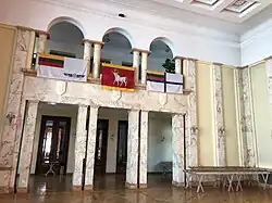 The Great Hall hosts the major events. During the Operation Bagration, in summer 1944, the Great Hall briefly served as a military hospital.[6] The interior is decorated with shields of six main branches of the interwar Lithuanian Armed Forces: Aviation, Engineers, Navy, Infantry, Artillery and Cavalry.[6]