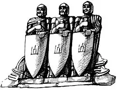 The building exterior was described as "modernized Renaissance".[5] The exterior is decorated with sculptural composition The Three Giants (Lithuanian: Trys milžinai) depicting three warriors of the Grand Duchy of Lithuania. Their shields feature the columns of Gediminas. The original sculpture survived because it was boarded up during the Soviet era.[7] Coat of arms of three cities decorate the entrance doors: taurus with a cross of Kaunas, Saint Christopher of Vilnius, and castle towers of Klaipėda. It was a clear political statement: during the interwar period, Lithuania was involved in territorial disputes with Poland regarding the Vilnius Region and with Germany regarding the Klaipėda Region. The sculpture and the coat of arms were created by Bronius Pundzius.[6] The first floor windows are covered with grates more as a decoration than for security – without them the large windows looked more like display windows.[5]
