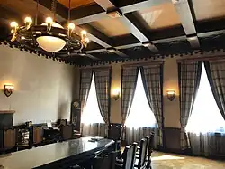 The Art Deco style chamber was created by painter Gerardas Bagdonavičius.[6] It was designed as a symbol of Lithuania's present.[3] The chamber has one of two fireplaces in the building; this one is made from faux black marble. The chamber is furnished with hand-carved table and chairs designed by Bagdonavičius in 1937: a conference table 4 metres (13 ft) in length, 12 armchairs, 12 chairs, 12 stools, two side tables, and a display cabinet.[5] The room displays artillery shells from the Lithuanian Wars of Independence, linen canvas, and framed Vytis.[6]