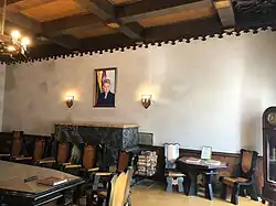 The sitting-room also has a still operational grey and white marble fireplace, decorated with authentic bas-reliefs by Petras Rimša that depict Vytautas the Great and map of the Grand Duchy of Lithuania during his reign. The bas-reliefs were saved by Rimša's nephew architect Aidas Rimša.[3] The room is also decorated with Lithuanian folk art symbols; for example, solar symbol Swastika decorates benches created by Jonas Prapuolenis.[6] The wooden floor tiles mimic design found in Lithuanian woven fabrics.[7] The walls are decorated with chandeliers made from antlers, chairs are covered with boar pelts.[6] The room has stained glass windows (originals by Stasys Ušinskas, reconstruction by Vytautas Švarlys) that depict medieval coat of arms.[3]