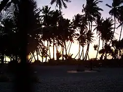 Plants include coconut palms (Cocos nucifera), pandanus trees (Pandanus tectorius), Scaevola taccada, Tournefortia argentea, Casuarina equisetifolia and Ipomoea pes-caprae.