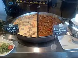 A related dish, also known as kavurma, involves frying the finely minced meat slowly to render down the fat in a technique analogous to confit.[7] Like confit, the meat can then be stored in jars or other containers sealed with a layer of fat: commercially produced versions are available from Turkish grocers.[1] This type of "winter" kavurma was in the past an important part of the diet of the Turkish military,[8] and was particularly used in times when fresh meat was scarce. It was often prepared from the meat of sheep slaughtered in the autumn, for storage during the winter,[9] when small amounts would be used to flavour vegetable and cereal dishes.[9] In Lebanon and Syria, the same preserving method is known as qawarma, and as qāwurma in Iraq, though in the latter the word is also used for the simple sautéd meat dish also found in Turkey.[10][7] The same confit-like technique is also used in Turkmenistan to preserve lamb or camel meat.[7]