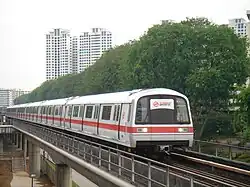 The C151 was also the basis for the Taipei Metro C301, built from 1992 to 1994 by the Kawasaki and Union Rail Car Partnership, for the Taipei Metro's Tamsui–Xinyi Line.[35] Between 1994 and 1996, original rail wheels of all 66 Kawasaki C151 trains were progressively replaced with German-made rail bogies equipped with absorbers that dampened vibrations on the wheels in motion. The replacements were made at a cost of $5.4 million, and were part of enhancement works in conjunction with the commencement of the Woodlands extension.[36]