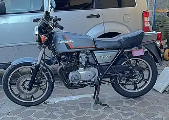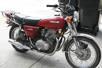 The original Kawasaki KZ400 was a 398 cc twin cylinder motorcycle produced from 1974 to 1984. The engine had twin balancer shafts to reduce vibration, one in front of the crankshaft and one to the rear, both moving in the opposite direction to the rotating crankshaft.[1] An emission control system recycled "blow-by" gases. The manufacturers advertised it as a "most practical all-round machine".[2]