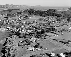 Kawhia hospital in 1963, with Te Maika and Albatross Point in the distance and the Methodist Church near the centre
