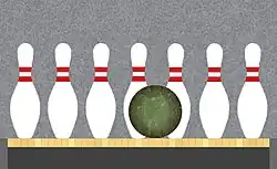 Kayles is played with a row of tokens, which represent bowling pins. The row may be of any length. The two players alternate; each player, on his or her turn, may remove either any one pin (a ball bowled directly at that pin), or two adjacent pins (a ball bowled to strike both). Under the normal play convention, a player loses when they have no legal move (that is, when all the pins are gone). The game can also be played using misère rules; in this case, the player who cannot move wins.