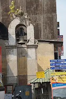 The Kayman's Gate bell purportedly dates back to the 16th century, where it originally hung in a Portuguese church dedicated to Saint Francis in the Royal City of Kotte.[5] Although Kotte was abandoned in 1565, the Dutch later reoccupied it and found a bell amidst the ruins of the church. This bell was relocated to a newly constructed bell tower at Kayman's Gate, where it was used as a curfew bell ‘to mark the closing of the Castle’s gates and lights out’. Following the demolition of the fort's walls, the bell was used to summon the worshippers to prayer and praise at the Wolvendaal Church, with the bell tower becoming part of the church's property.[6]