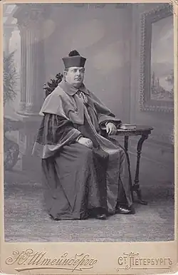 In 1892, Bishop Paliulionis dismissed Jaunius from the priest seminary because he was not following the strict rules of the seminary.[17] As he was no longer welcome in the Diocese of Samogitia, Jaunius searched for another posting and considered Dorpat (Tartu).[18] He finally found a vacant deanery in Kazan in March 1893.[19] Jaunius possibly targeted Kazan because it had a university where Alexander Alexandrov, who had written on the Lithuanian language, was a professor.[20] However, the ordeal with the bishop negatively affected Jaunius' mental health. He was plagued by homesickness and loneliness and suffered from hallucinations and paranoia. When he could not hold a mournful mass for Tsar Alexander III of Russia due to his poor health, Tsarist authorities suspected political motives and wanted to exile him to Siberia. Instead, they put him in a psychiatric hospital.[21] In 1895, Jadvyga Juškytė brought Jaunius back from Kazan to Lithuania where he lived with friends and acquaintances trying to improve his health and recover, but had no means of earning a living.[22] He petitioned the Governor of Kaunas for a monthly disability pay and was hoping to get a teaching job at the Saint Petersburg Roman Catholic Theological Academy.[23] He frequently visited Saint Petersburg where he reestablished academic contacts. He helped Eduards Volters with the publication of the postil of Mikalojus Daukša and delivered three lectures on Lithuanian word endings to the Neo-Philological Society in 1898.[24]