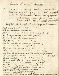 Jaunius studied the relationship between Indo-European languages and Finno-Ugric languages or Semitic.[49] He left notes for Lithuanian–Estonian (446 words) and Lithuanian–Finnish (474 words) etymological dictionaries. He also prepared a dictionary of loanwords of Baltic origin in the Finnish language (222 words).[59] He likely became interested in Finno-Ugric languages after reading a work of August Ahlqvist in 1878.[60] He claimed to have discovered equivalents of consonants in Proto-Indo-European and Proto-Semitic languages.[61] In his last decade, Jaunius was interested in many different topics and started many projects, but was unable to finish them.[62] A collection of his previously unpublished manuscripts was published in 1972.[63]