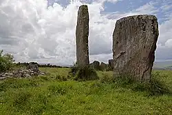 Five metres (16 ft) to the northeast the two tall standing stones, menhirs, are 1.6 metres (5 ft 3 in) apart.[6] The lower, broader one is 2.3 metres (7 ft 7 in) tall and the taller was originally 5.3 metres (17 ft). However, by the time of excavation this stone had fallen, presumably blown down in a gale, leaving a 5-metre (16 ft) broken piece and a stump protruding 0.30 metres (12 in) out of the ground. The excavators set the broken piece vertical again, discarding the stump, so it is now 4.3 metres (14 ft) tall.[5][4] Two metres (6 ft 7 in) southeast of the standing stones is the cairn with four kerb stones.[4]