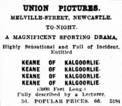 Keane of Kalgoorlie, or a Story of the Sydney Cup is a 1911 Australian silent film set in the racing and gambling circles of Sydney, based on a popular play by Edward William O'Sullivan and Arthur Wright, adapted from the novel by Wright.[5]