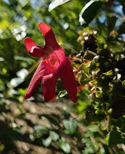 The plant produces inflorescences on hairy pedicels with many flowers. Each flower is tubular opening into a wide mouth with three narrow, pointed lower lobes and two upper lobes joined into a straight flap or curving lip. The flower is up to 4 centimeters wide and 3 long, and is bright red to orange red or deep pink. Inside the mouth are long filamentous stamens and one flat, yellow-hairy sterile stamen called a staminode.[3]
