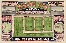 In September 1925, approximately 55 to 96 residential allotments of the second section of "Kedron View Estate" were advertised to be auctioned by Cameron Bros, being subdivisions of portion 87 in the Parish of Kedron.[10] A map advertising the auction includes a locality map of the area and states the allotments were within 5 minutes' walk of the new tram terminus, with electric lights at the corner of Turner and Richmond Roads, and water mains in Richmond Road.[11]