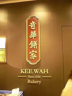 Kee Wah Bakery was founded by Mr. Wong Yip Wing in 1938 as a small grocery store in a corner of Shanghai Street in Kowloon, Hong Kong. A few years later World War II began and the store was forced to close. At that time one of the employees used some simple tools and an old oil barrel as an improvised oven, and began baking pastries to sell to the boat dwellers on the harbour. This marked the beginning of Kee Wah Bakery. Since then, Kee Wah has become one of Hong Kong's oldest bakeries, and has made its name in Chinese Wedding Cakes and Mooncakes. In 1997 the baton of the business were passed to the second generation; Mr Kevin S Wong revamped the company's branding and product packaging by engaging renowned graphic designer Mr Suen Siu Wah to overhaul the corporate identity, product packaging, outlet interiors and staff uniforms.[1] Headquarter is located at Kee Wah Industrial Building, 666 Castle Peak Road, Cheung Sha Wan, with production lines; There is also a production centre in Taipo Industrial Estate which started in 2009.