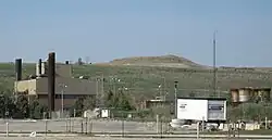 It is a combined cycle plant consisting of two 1 MW gas turbines, two boilers which operate on landfill gas and recovered waste heat, and one 30 MW steam turbine.[27] The pipe system extracts 17,005 standard cubic feet per minute (119 million cubic metres annually) of landfill gases from the collection field,[27] which consists of "over 40,000 linear metres of horizontal gas collection trenches and 80 vertical gas collection wells installed within the landfilled waste".[2] Circling the site is a 10,000 linear metre dual header piping system which is used for the transmission of gas from the wells and trenches to the flaring station.[2]