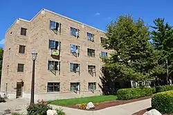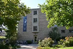 Keenan and Stanford are hosted in two wings of the same building, built on the spot that once hosted the toboggan of the university's minims program. They are connected by a lobby and the chapel of the Holy Cross which they share. Keenan Hall is four stories high.[14] The building is representative of functionalist architecture with a simple double-L shape plan, a flat roof, and little exterior ornamentation. Until the mid-1960s, it was a hall for incoming freshmen.[20] It was designed by Ellerbe Becket and built by the M.J. McGough Company.[15] The entrance doors are split in between the two dorms, and traditionally, Keenan residents do not use the Stanford doors and vice versa.[12] The corridors of Keenan are blue and white, reflecting the dorm colors.[21][19] Each floor is divided into two sections, North and West.[22]