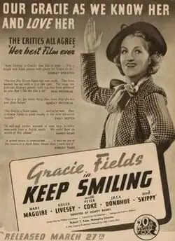 Keep Smiling is a 1938 British comedy film directed by Monty Banks and starring Gracie Fields, Roger Livesey and Mary Maguire. The film follows a group of performers who club together to buy a bus and travel around the country doing shows after they are cheated out of money by an ex-manager.