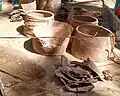 Almost 48 square pits have been cut and various structures and artefacts have been found, including frosts, brick walls, roof tiles, pottery, mimic accessories, skeletal tools, iron Vel, and Tamil-Brahmi letter-etched plates.[25] This place is considered to be Pandyan dynasty's city called "Perumanalur", the pioneer of literature.[40] The use of fired brick, the size of the building complex, an array of pots placed in such a way that it must have been used either as a lamp or for painting, and other findings suggest that the settlement is of a more civilised population than was previously suspected during the Sangam period.[41][42]