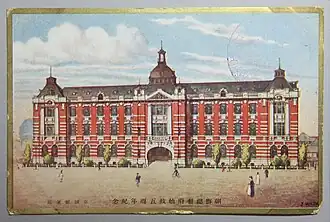 Construction on the building began on October 23[3] 1913, and it was completed on September 15[3] 1915.[4][1] It began operating on October 1, the anniversary of the Japanese Governor-General of Chōsen's establishment.[3] Its designer is unknown. Its style has been described as British-influenced.[4] It was a large brick building with a total floor area of 1,320 pyeong (4,400 m2), with one underground and three above-ground floors.[4][1] It had a large dome in the center of the building, with arches above its windows.[4][1] It was located at what is today the intersection of Namdaemunno and Chungmu-ro.[3] The building was very centrally located, with the Bank of Chōsen and a Mitsukoshi shopping mall (now Shinsegae) nearby.[5]