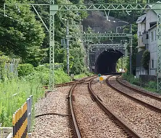 ![]() The dual-gauge track near Jimmuji station that allows for narrow-gauge rolling stock to be transferred from the J-TREC factory to JR tracks near Zushi Station. | |
