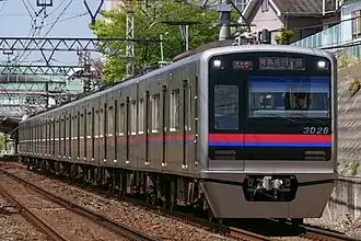 The Keisei 3000 series (京成3000形) is a DC electric multiple unit (EMU) train type operated by the private railway operator Keisei Electric Railway on commuter services in the Tokyo area of Japan since 2003.[4] A total of 19 eight-car sets and 29 six-car sets have been built by J-TREC (formerly Tokyu Car Corporation) and Nippon Sharyo between 2002 and 2019.[2]