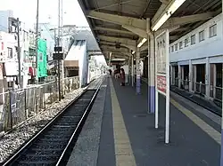 The station features a single island platform accessible via a footbridge that connects to an elevated station building.