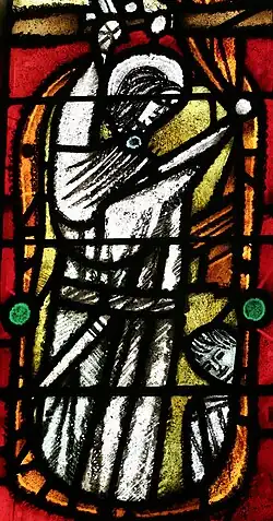 Between 1958 and 1963 alongside the experimental projects, New worked on several important painted and stained leaded glass designs, including the clerestory windows at St Mary’s Church in South Ruislip (1958),[20] Bethnal Green,[11] St Nicolas Cole Abbey[18] and St John the Baptist in Ermine.[9] Both Bethnal Green and Ermine achieved their effect through use of coloured and flashed glass. South Ruislip continues the heavy symbolism New employed in his Coventry designs, while Bethnal Green and Ermine are abstract.[11] In St Nicholas Cole Abbey, New’s brilliance at figurative depiction is most evident.