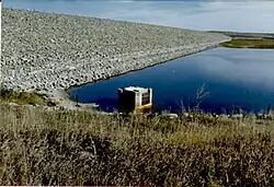 Norton Dam is a zoned earth-fill embankment dam with rock riprap on its upstream face.[6] It has a structural height of 151 feet (46 m) and a length of 6,450 feet (1,970 m). At its crest, the dam has an elevation of 2,347 feet (715 m).[13] A spillway structure controlled by three radial gates is located at the southeast end of the dam. Outlet works at the northwest end of the dam manage outflow into Prairie Dog Creek and the city of Norton's municipal water supply.[6]