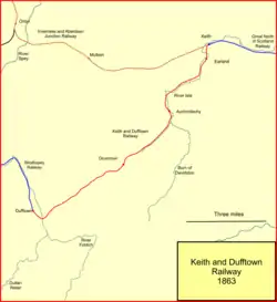 The motivation for a railway line linking Dufftown was still in place, and in 1856 plans were deposited for the Keith and Dufftown Railway. It was to be a nine-mile line, with a possible extension to mineral workings in Glenrinnes; capital was proposed to be £50,000; the bill allowed for the line to be worked by either the GNoSR or the Inverness and Aberdeen Junction Railway. The GNoSR, itself desperately short of money, agreed to subscribe £1,000 to the new company. On that basis the Keith and Dufftown Railway was authorised by an act of Parliament, the Keith and Dufftown Railway Act 1857 (20 & 21 Vict. c. lxxxvii) of 27 July 1857. Most of the route closely followed the River Isla but there were some stiff gradients.[4][5][6][7]