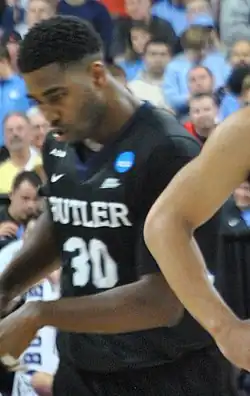 Despite dealing with lower back spasms, Martin scored 19 points, grabbed six rebounds, and made four assists in Butler's 74–65 victory over Middle Tennessee State to reach the Sweet 16.[8] In his junior season, Martin led the Bulldogs in scoring (16.0 points per game) and rebounding (5.8 per game) while shooting 43 percent from the floor and 35 percent from behind the arc.[7] He was one of ten finalists for the Julius Erving Award as Division I's top small forward.[15] Martin was a Second Team All-Big East selection as a junior.[16] The National Association of Basketball Coaches named Martin to the All‐District 5 Second Team on March 22.[17] After the season, Martin undertook an internship with the TV station WTHR-13, working in video production and editing. He did not enter the NBA draft, since he wants to improve his mobility, and he is cooking his own food as a means of controlling his diet.[7]