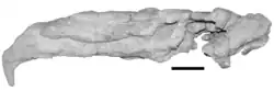 The nostrils are small, rectangular, and are located in the upper hind corner of the upper beak as in patagornithines (the size and location of the nostrils is unknown in the larger phorusrhacines and brontornithines). The nostrils appear to be longer from front to back than high, though this may be exaggerated by crushing, and their hind margin is formed by the maxillary process of the nasal bone (a projection from the nasals towards the maxilla, the main bone of the upper jaw). Whether the nostrils are connected to each other at the middle (lacking a septum as in other phorusrhacids) is not discernible. The quadrangular shape of the antorbital fenestra (an opening in front of the eye socket) is clear despite it being crushed somewhat on both sides. The front border of this opening is approximately level with the hind margin of the nostril, and its lower margin is straight when viewed from the left side. Robust lacrimal bones form the hind margins of the antorbital fenestrae, and these bones were recessed in relation to the jugal bar (that formed the lower edge of the eye socket) and the outer side margin of each frontal bone (main bones of the forehead). The antorbital fenestra is proportionally smaller than that of Patagornis.[3][4]