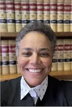On August 10, 2022, California Governor Gavin Newsom nominated Evans to serve as an associate justice of the Supreme Court of California, to the seat to be vacated by Patricia Guerrero, who has been nominated to serve as chief justice.[1] She would be the first openly lesbian associate justice,[4] and the second out African-American to serve on the court.[5] On November 10, 2022 the Commission on Judicial Appointments voted unanimously to approve Evans to the California Supreme Court.[6][7][8] She was sworn into office on January 2, 2023.[9] As of 2023, with her swearing in, Black justices make up half of the associate justices on the court.[10] She is the first openly LGBTQ Woman and first LGBTQ Woman of Color to serve on the court.[10]