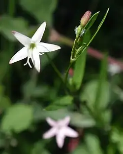 A thin-branched open inflorescence produces a few small bright pink or white flowers. The flower is funnel-shaped with the rounded, hairy green fruit developing at its base. The flower has narrow, pointed lobes on its open face. Its bloom period is from May to August.[1]