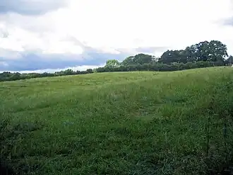 As well as being a hill fort, Kelsborrow Castle is a type of promontory fort, as it exploits the natural steep slopes of the area to create a defensive site.[1] The site is surrounded by an artificial bank and ditch, although there is a gap in the ditch for around 400 ft (120 m) in the west. This is probably because the ground slopes sharply away where there is no ditch.[6] The best surviving parts of the bank are 6 ft (1.8 m) high, and the distance between the outer edge of the ditch and the inner edge of the rampart is 100 ft (30 m).[6] The defences cover 1.75 acres (0.71 ha), and enclose an area of 7.25 acres (2.93 ha).[7] The entrance of the fort is probably in the south-east.[2] Multivallate (more than one series of earthworks) forts are common in southern England; that Kelsborrow Castle is single vallate (i.e. it has only one ditch and bank) means it is probably a one-phase site, indicating it would only have been used for a short time.[8] The hill fort is similar in typology to the hill forts at Bradley, and Oakmere, in Cheshire, and Castercliff and Portfield in Lancashire.[8]