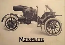 Carl Kelsey designed an automobile that would be less expensive than the Model T. Introduced in September 1910, the three-wheel vehicle was the Motorette, built in Hartford, Connecticut. The Motorette (a name that he trademarked),[1] was rear-wheel driven by a two-stroke, twin-cylinder engine which was air-cooled on early models.[1][2] Later models were water-cooled, with the radiator mounted behind the engine.[2][1]