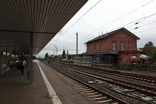 The entrance building was built in 1863. It is still almost in its original condition and is built in the standard style of the Hessian Ludwig Railway (Hessische Ludwigsbahn). Raunheim station is identical. It is built of red sandstone on a rectangular ground plan as a symmetrical two-story building covered by a gabled roof. The ground floor contained the main hall and a waiting room. In the basement there was a service room and rooms for handling freight. The upper floor housed the apartment of the stationmaster. In front of it is a southern extension with function rooms. The historic station building is now no longer for rail purposes; instead it houses a restaurant. The entrance building is a monument under the Hessian Monument Protection Act.[3]
