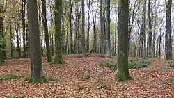 There are three associated scheduled sites containing underground structures, rare examples of Auxiliary Unit constructions built in World War II to defend against Nazi invasion: an operational base (location: 51.6211, −2.8971, 35 metres diameter) and ammunition store (location: 51.6214, −2.8967, 20 metres diameter) – both in the woods on the northeast side of Pen-toppen-ash – and a 'special duties section' (location: 51.6186, −2.9018, 20 metres square) on the very northwest edge of Pen-toppen-ash.[18]