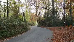 The earthwork is a motte-and-bailey castle built during the mediaeval period, consisting of a roughly-rectangular enclosure, 26 metres northwest-to-southeast by 18 metres. The mound is at the northeast of the enclosure, right by the road which follows a historical defensive ditch. The site appears to have been reduced in size by landslips on the sharply-dropping western side. The circular motte is steep, approximately 3 metres high and 7 metres in diameter. One source considers the motte as the remains of a late cutting through a partial and damaged ringwork, i.e. not defensive and with an unclear purpose.[3] South of it is an approximately 2.5-metre-high bank which ends just before the edge of the slope, possibly indicating the entrance. There is a ditch on the south side of the slope approximately 2 metres wide and deep.[3][4]