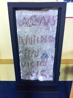 The Victoria County History entry describes this as "an inscription found some years before 1818, lying in two pieces with other stones 4 feet (1.2 m) deep in the west wall of the kitchen garden of the parsonage farm, north-west of the church. Many of the other stones were cemented together and formed some kind of ancient foundation; whether the inscription was one of these, is not recorded. It is itself a flat slab of freestone, 33 inches (840 mm) high by 20 inches (510 mm) wide, and is now in the Worcester Museum. It reads as follows:[5]