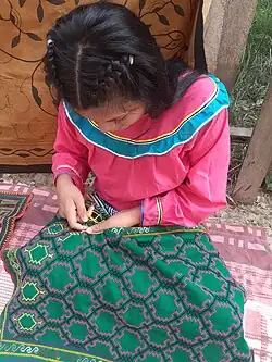 The kené designs are part of the cultural identity and are markers of the ethnic identity of the Shipibo-Conibo people.[13] These designs are painted on the body (face), wooden utensils (oars, pipes, maces), textiles (skirts, shirts ) and ceramics.[1] Traditionally it is women who transfer the designs on ceramics, textiles and the body, while men carve the designs on wooden utensils.[14] When they are embroidered on textiles they are called kewé.[3][15]