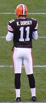 Kenneth Simon Dorsey (born April 22, 1981) is an American professional football coach and former quarterback who is the passing game specialist for the Dallas Cowboys of the National Football League (NFL). Dorsey was most recently the offensive coordinator for the Cleveland Browns. He played college football for the Miami Hurricanes, where he won the national championship and the Maxwell Award in 2001. He was selected by the San Francisco 49ers in the seventh round of the 2003 NFL draft, later playing for the Cleveland Browns and the Toronto Argonauts of the Canadian Football League (CFL), before retiring in 2010.[1]