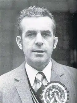 Gibson stood as the VPP's candidate for the West Belfast constituency in the October 1974 General Election. His candidacy came in for criticism from within the UVF. Gusty Spence, who supported the formation of the VPP, criticised Gibson's decision to run for election, arguing that it was much too soon for the party to think about making any inroads on the mainstream unionist vote.[24] Stronger criticism came from an anonymous commentator, identified by Jim Cusack and Henry McDonald as a "senior west Belfast UVF figure at the time", who claimed that not only did Gibson attempt to force him out of his role as head of the Young Citizen Volunteers but even accused Gibson of orchestrating the assassination of former UVF Chief of Staff Jim Hanna, who was killed on 1 April 1974.[25] Although Gibson received the support of West Belfast UDA leader Charles Harding Smith, Glenn Barr of Vanguard and independent Shankill councillor Hugh Smyth, he finished fourth behind the Democratic Unionist Party (DUP) candidate John McQuade, who garnered 16,265 votes against Gibson's 2,690,[26] with the seat won by the incumbent MP, Gerry Fitt of the Social Democratic and Labour Party (SDLP).