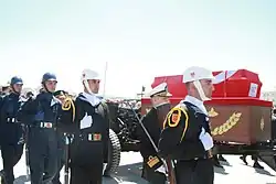 Evren died at a military hospital in Ankara on 9 May 2015, aged 97.[31] On 12 May, he was buried in the Turkish State Cemetery in Ankara following the funeral service held at Ahmet Hamdi Akseki Mosque. The funeral was attended by his close relatives and military personnel. In protest, political parties sent no representatives to the former president's funeral. A number of people protested during the religious service in the mosque's courtyard.[32]