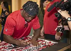 Kenjon Fa'terrel Barner[1] (born April 28, 1989) is an American former professional football player who was a running back in the National Football League (NFL). He played college football for the Oregon Ducks, earning consensus All-American honors in 2012. Barner was selected by the Carolina Panthers in the sixth round of the 2013 NFL draft. He was also a member of the Los Angeles Chargers, Philadelphia Eagles, New England Patriots, Atlanta Falcons, Baltimore Ravens and Tampa Bay Buccaneers.